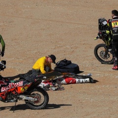 El percance es todavía más serio si se tiene en cuenta que esta es la etapa maratón del Dakar, donde los competidores no disponen de sus mecánicos para reparar sus unidades y cualquier avería deberá ser solucionada por la tripulación.