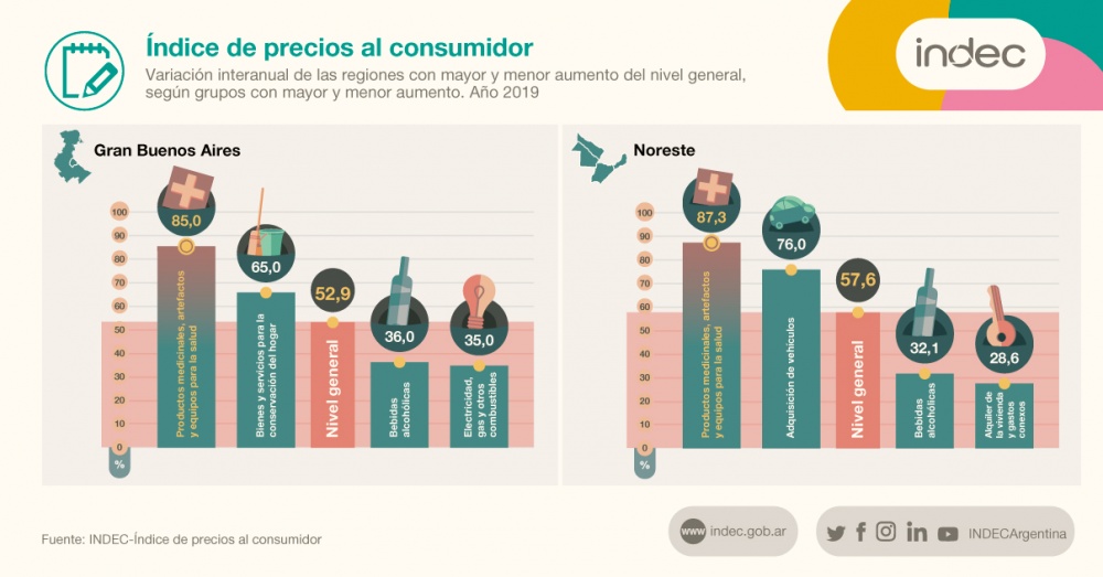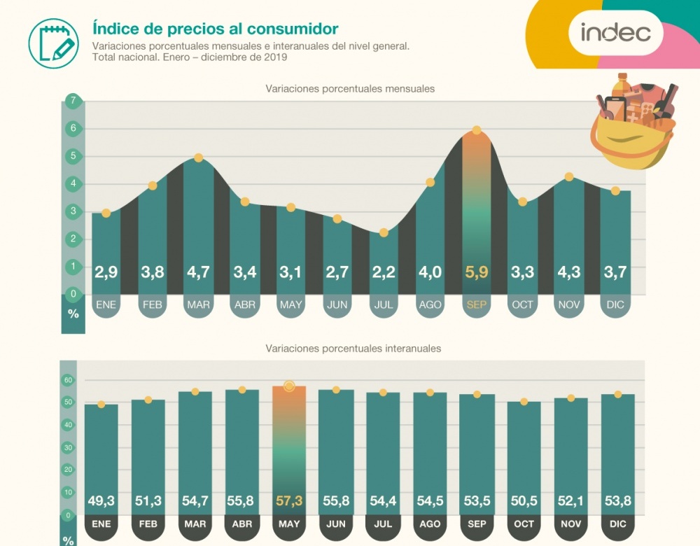 La suba anual registrada en 2019 fue la mayor desde 1991, cuando se ubicó en el 84%, impactada por la emisión monetaria, la devaluación del peso y el ajuste de las tarifas. Analistas pronosticaban un avance de precios del 54,6% en 2019.