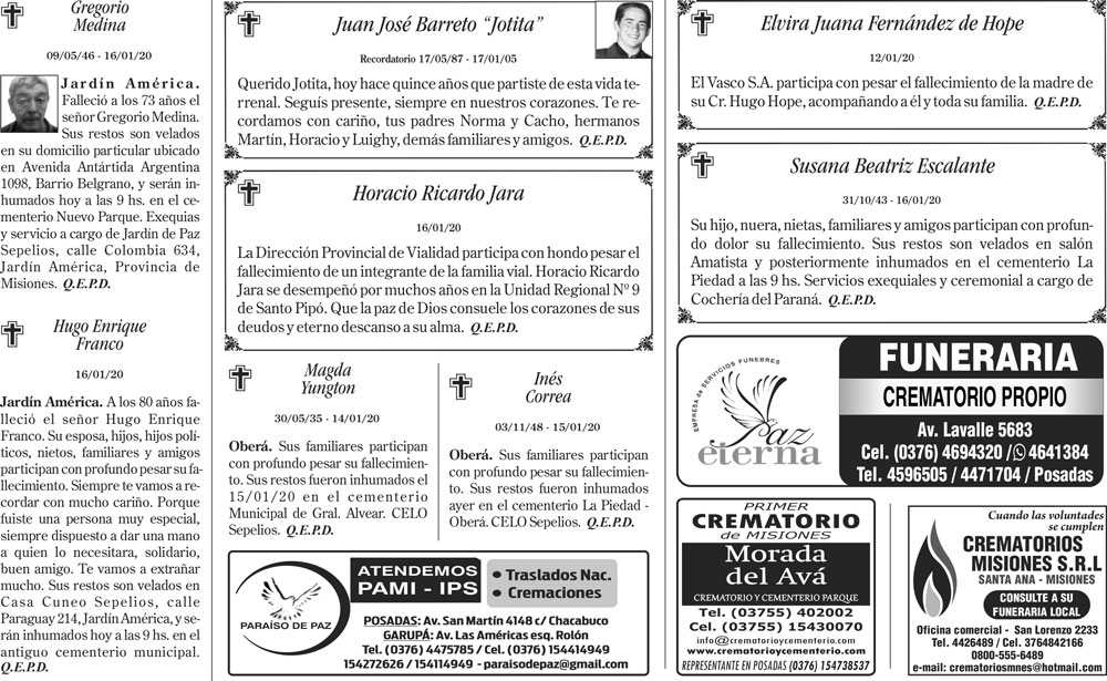 Fúnebres del viernes 17 de enero de 2020