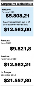 En comparación con otras provincias, los básicos de los docentes misioneros se quedan muy por debajo. Por ejemplo, en San Luis y Formosa, un básico de cargo Maestro de Grado está en 12.562 pesos y 9.821 pesos a junio del 2019 respectivamente. Mientras que en Misiones, el básico por ese cargo está en 5.808 pesos.