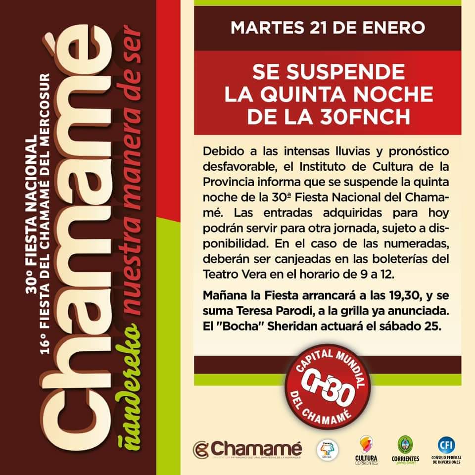Debido a las malas condiciones del tiempo, el Instituto de Cultura de Corrientes informó este martes que se suspendió la quinta noche de la Fiesta Nacional del Chamamé, que se desarrolla en el Anfiteatro Mario del Tránsito Cocomarola de la capital correntina.