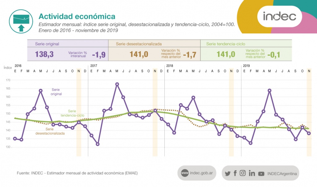 Las cifras del Estimador Mensual de Actividad Económica (EMAE), que registra ya diecinueve meses consecutivos de contracción, muestran una baja del 1,7% en noviembre, en la medición desestacionalizada con relación a octubre.