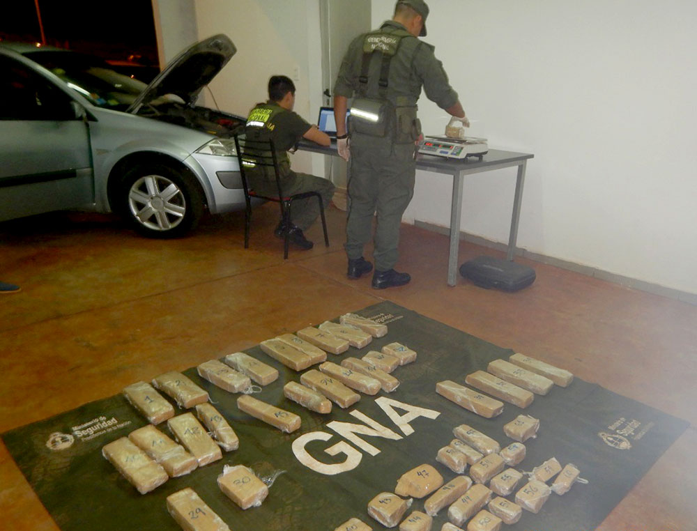 Inmediatamente, los funcionarios al observar las imágenes del escáner, advirtieron la presencia de material orgánico en el interior del rodado. Ante testigos comenzaron a extraer del torpedo, detrás del respaldo de las plazas traseras la cantidad de 61 paquetes de diferentes formas y tamaños con marihuana, alcanzando un total de 33,588 kilogramos.