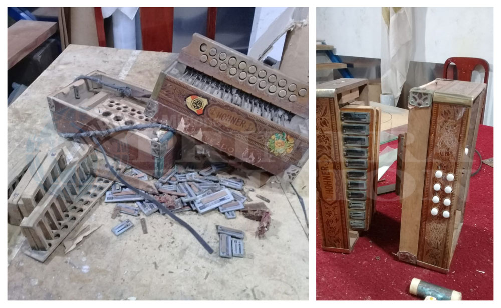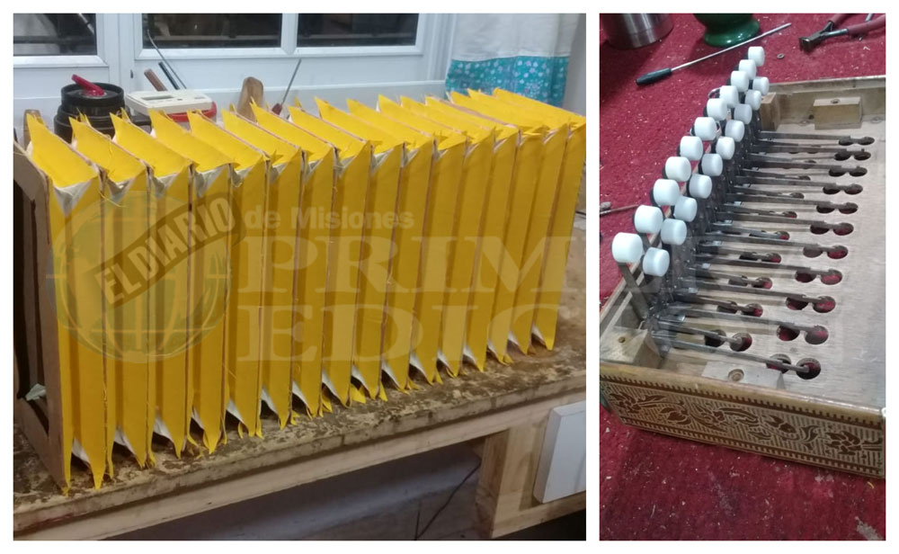 Uso mecánica dental para algunas cosas; para otras, pinzas de cirugía, mini tornos, un granulado de cartón para los fuelles nuevos. No hay un lugar específico para adquirir cosas, entonces fui fabricando las mismas herramientas, los elementos para los arreglos. Con cada instrumento que uno tiene es un romance que uno tiene”.