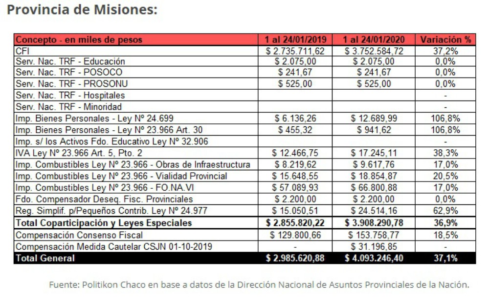 En lo que va de 2020, Misiones fue la que tuvo el menor crecimiento, dentro del NEA, de transferencias automáticas de recursos de origen nacional destinadas a las provincias.