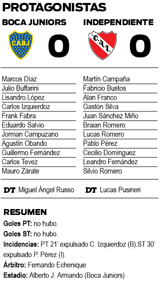 Claro que en ese marco de coincidencias también hubo un expulsado por bando, aunque la prematura salida por doble amarilla de Carlos Izquierdoz influyó más en el desarrollo que la inexplicable del segundo tiempo de Pablo Pérez, quien vio la roja directa por una fuerte plancha a su ex compañero Jorman Campuzano.