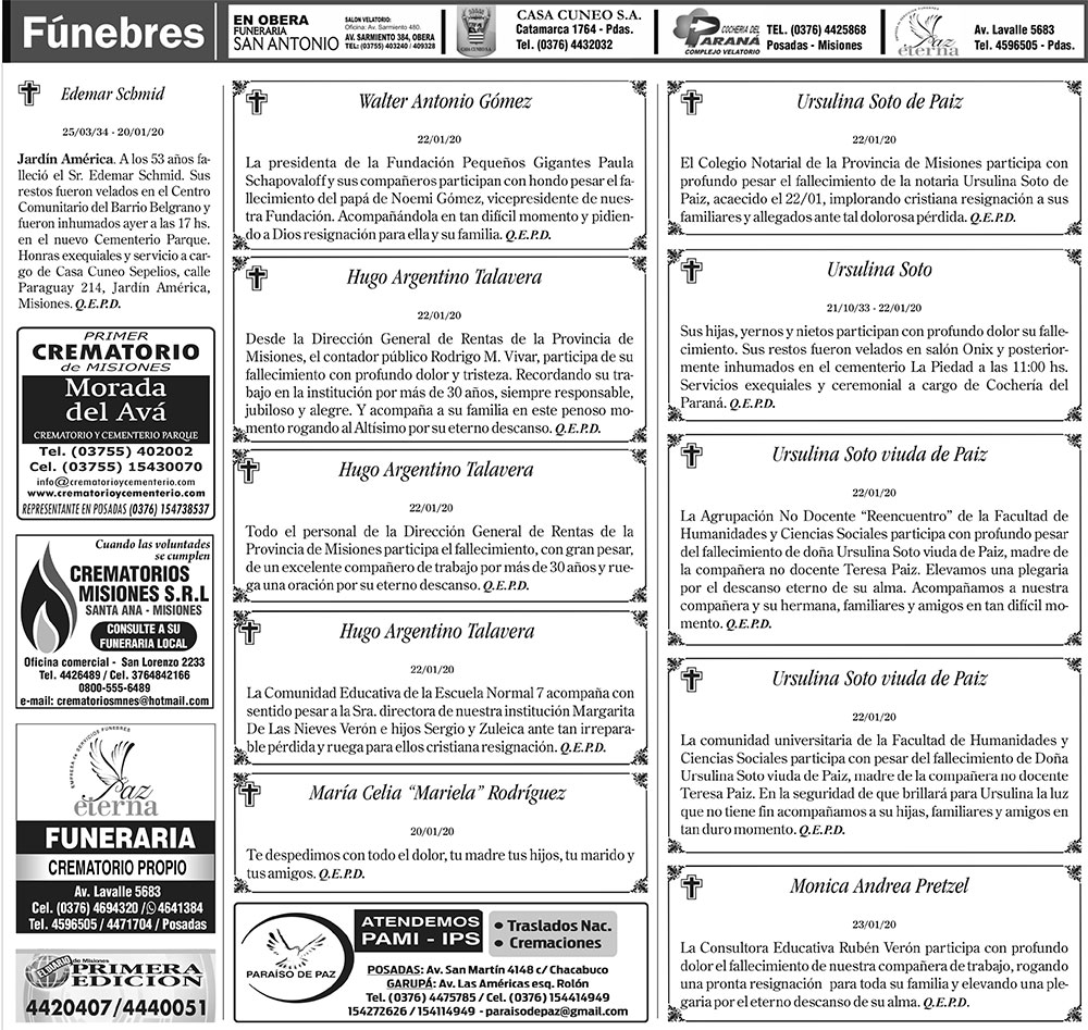 Fúnebres del viernes 24 de enero de 2020