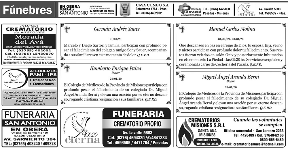Fúnebres del sábado 25 de enero de 2020