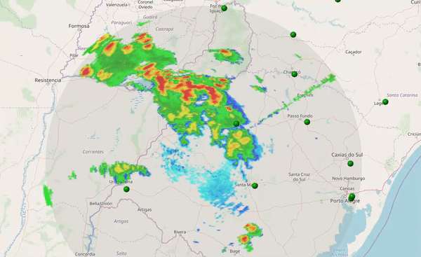 En parte del área de cobertura se registran lluvias y tormentas, algunas de las cuales son fuertes, acompañadas por intensas ráfagas de manera localizada, caída de granizo y abundantes precipitaciones en cortos períodos.