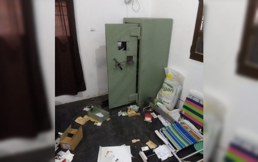 La caja de caudales presentaba dos cortes rectangulares en la puerta. Los ladrones literalmente destrozaron el sistema de trabas para apoderarse del dinero que había allí.