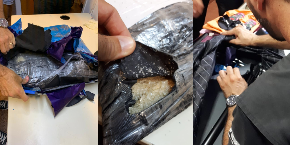 El primero en ser descubierto fue un hombre de 29 años, de nacionalidad paraguaya pero con residencia en Argentina. Al profundizar la requisa al equipaje, descubrieron con la ayuda de los rayos de un escáner que transportaba paquetes ocultos. Al abrirlo dieron con poco más de 12,330 kilogramos de la droga de alto valor en el mercado de consumo argentino, pero casi diez veces mayor si se distribuye en capitales europeas.