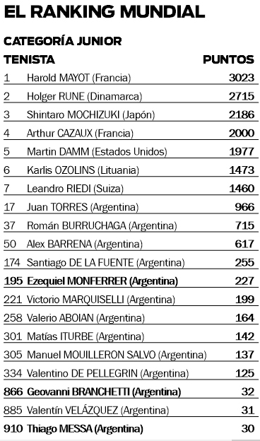 Siempre hablando en la categoría Junior, tras avanzar a la segunda ronda en Paraguay, Monferrer (16) sumó puntos clave que le permitieron subir nada más y nada menos que 19 posiciones, para ubicarse ahora en la 195 ubicación, con 227 unidades. El posadeño es el quinto argentino en la lista mundial y el único que subió entre los seis mejores del país.