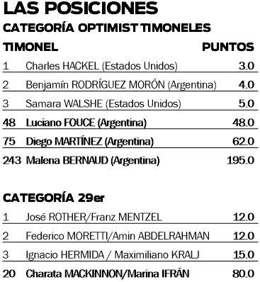 En lo que respecta a la categoría Optimist, el mejor misionero posicionado es Luciano Fouce, quien suma 48 puntos y se ubica justamente en esa misma posición. Más atrás aparecen Diego Martínez y Malena Bernaud, todos de la escuela Optinic de Posadas, a cargo de Nico Dasso.
