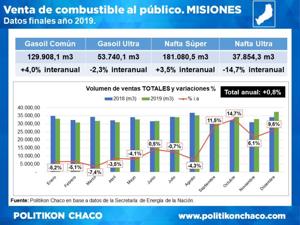 Durante enero 2020, en Misiones el gasoil común tuvo un crecimiento interanual del 4% al totalizar ventas de 129.908,1 mc. Mientras que la nafta súper creció un 3,5% (181.080,5 m3). Por el contrario, las caídas se dieron con el gasoil ultra, un -2,3% (53.740,1 m3) y la nafta Premium que sufrió una reducción del -14,7% (37.854,3 m3).