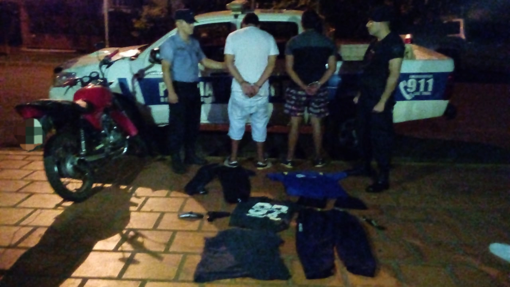 Dos delincuentes de 24 y 30 años fueron detenidos durante la madrugada de este miércoles en avenida Islas Malvinas y calle Colón de la localidad de Apóstoles tras ser perseguidos por efectivos de la UR-VII tras un asalto en modalidad motochorros en un comercio.