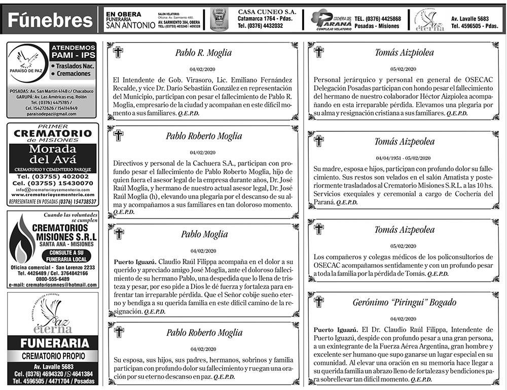 Fúnebres del jueves 6 de febrero de 2020
