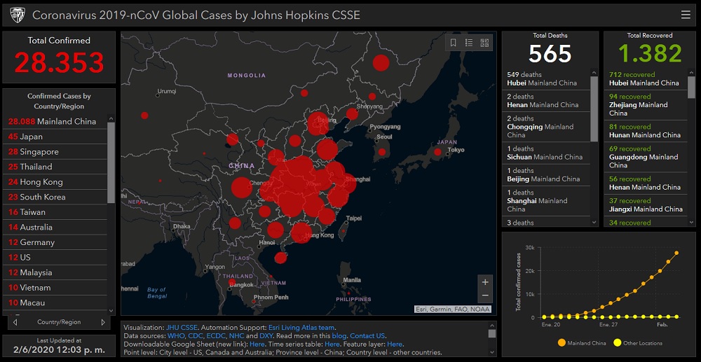 El Centro Johns Hopkins de Ciencia e Ingeniería de Sistemas ha creado un mapa interactivo, desarrollado con la plataforma ArcGIS de Esri, en el que se recopilan datos en tiempo real sobre contagios y casos de coronavirus (2019-nCoV) en todo el mundo.