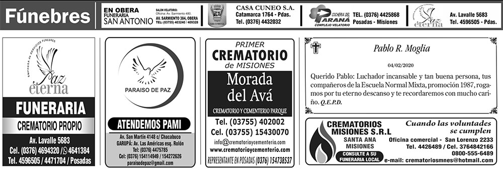 Fúnebres del viernes 7 de febrero de 2020