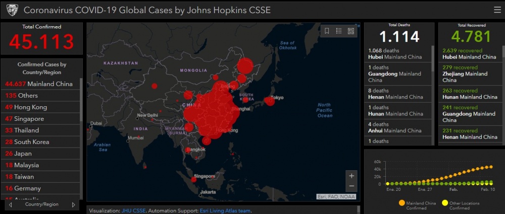 De acuerdo con las autoridades sanitarias chinas, se registraron también 1.638 nuevos casos confirmados de contagio, y con ello el número total de personas contaminadas en todo el país ya supera los 45.113.