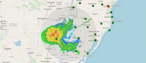 Según el reporte, sobre el área de cobertura se desarrollan lluvias y tormentas de variada intensidad, algunas de las cuales pueden ser localmente fuertes y estar acompañadas de fuerte actividad eléctrica, abundante caída de agua en cortos períodos, ráfagas y ocasional caída de granizo.