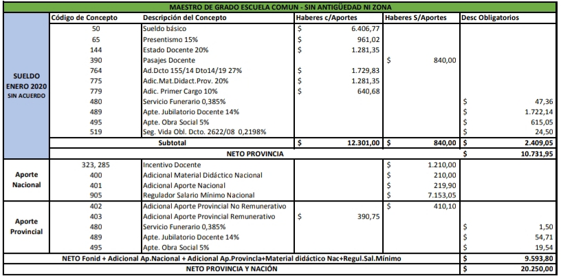 El aumento del 20% al básico docente no impactaría sobre el sueldo mínimo bolsillo de los maestros sin antigüedad, sin zona y con un solo cargo (cargo testigo) que, gracias al fondo nacional compensador, seguirán cobrando el mínimo de 20.250 pesos. En otras palabras, los que menos cobran seguirán percibiendo lo mismo según las simulaciones realizadas en las últimas horas por los docentes y sindicatos que no fueron convocados a la llamada Mesa de Diálogo y Comunicación.