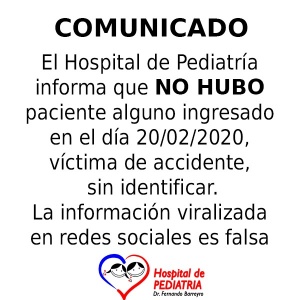 Este jueves 20, tras tomar conocimiento de una noticia falsa que circula en redes sociales para pedir ayuda, supuestamente destinada a un niño internado, desde el Hospital de Pediatría,su gerente asistencial, Liliana Fernandez Sosa, alertó sobre la cuestión.