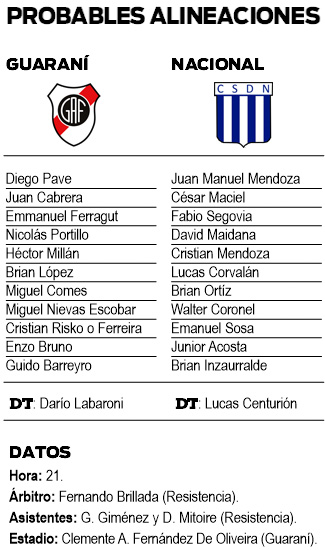 El dueño de casa tendrá al menos tres modificaciones para encarar este duelo. La vuelta de Diego Pave al arco es un hecho, pero también el DT evaluó en la semana el ingreso de Cristian Risko en lugar de José Dujaut, aunque también probó con Leandro Ferreira. Además, debido a las bajas de Leandro Zárate, Ricardo Vera y Ulises Silveira (lo esperarán hasta lo último), Guido Barreyro formó parte de los posibles titulares.