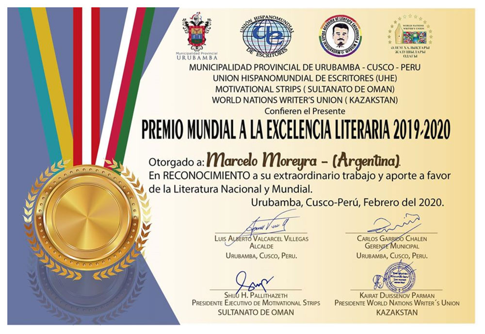 El artista misionero Marcelo Moreyra recibió una nueva distinción internacional. Se trata del “Premio Mundial a la Excelencia Literaria 2019-2020”. Consiste en un diploma en reconocimiento por los logros obtenidos a lo largo de su trayectoria. Hace escasos días la noticias fue comunicada por la titular de la Filial Argentina de la Unión Hispanomundial de Escritores (UHE) y por el propio fundador y director de la entidad, el consagrado escritor peruano Carlos Hugo Garrido Chalén, desde sus oficinas de Urubamba, Cusco, Perú.