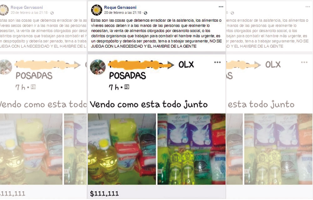 El diputado provincial Roque Gervasoni hizo una denuncia pública, a través de la red social Facebook, al ver que algunos ofrecen en los grupos de compra-venta la mercadería que es entregada por el Estado para la asistencia social.