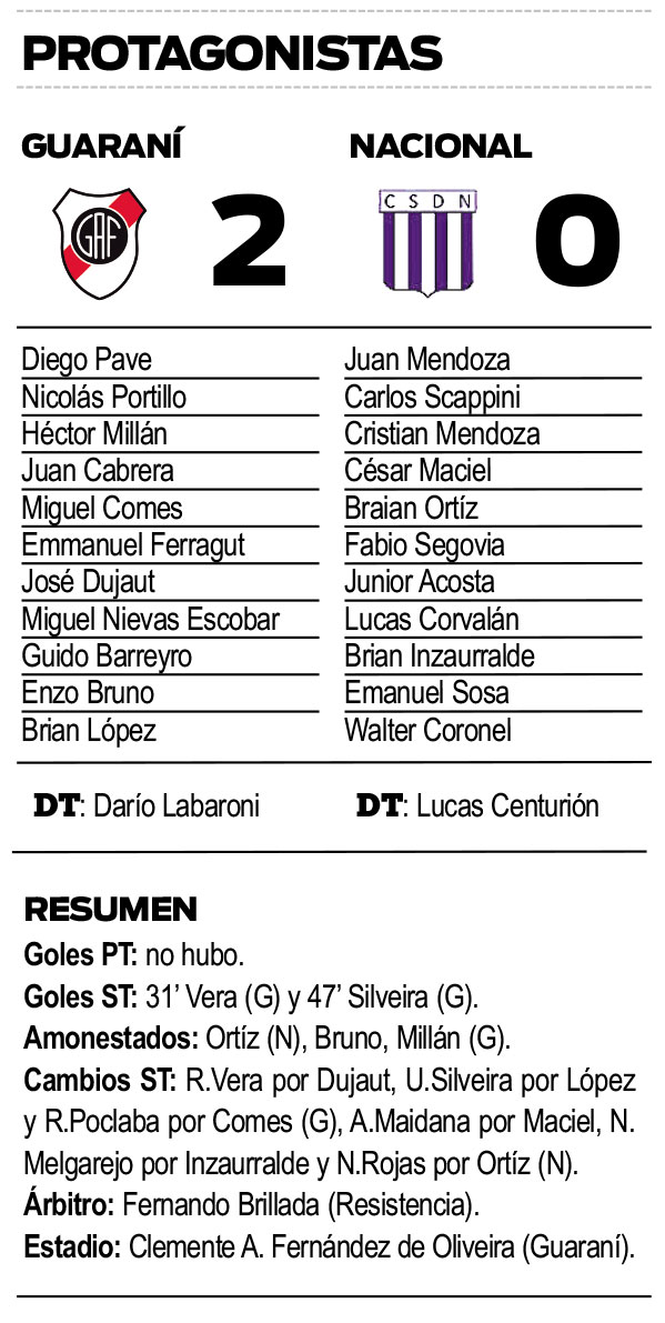 Los cambios surtieron efecto en el local. El Nacio sintió el desgaste por la presión que efectuó en el primer tiempo y le cedió la pelota a Guaraní, que explotó las bandas y comenzó a llegar con peligro. Primero fue Silveira, a puro coraje, y después Vera, picante por la derecha. Entre los dos, asociados ahora sí con Bruno, le cambiaron la cara a La Franja.