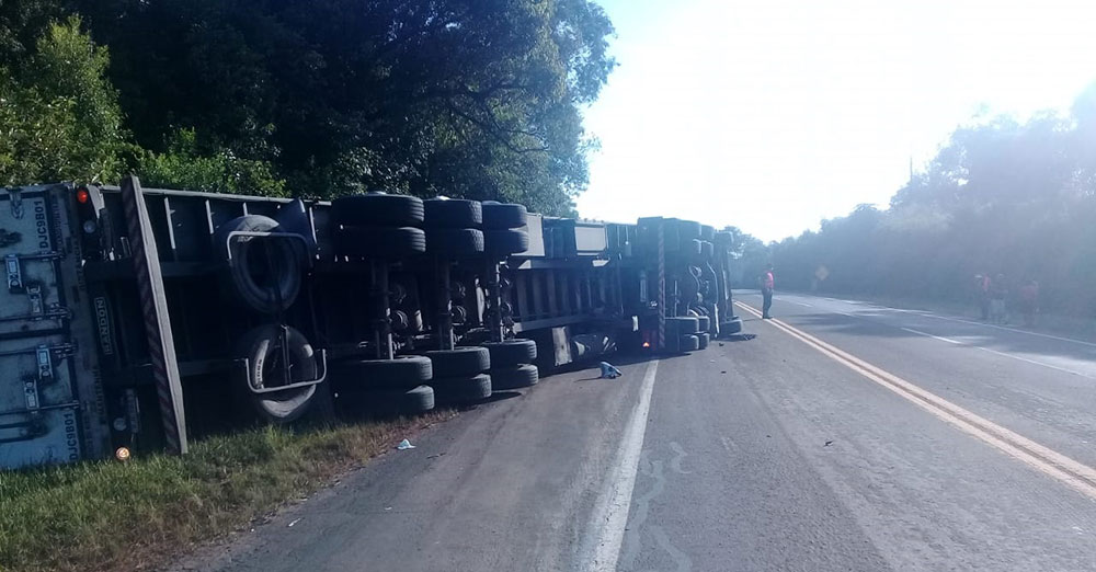De inmediato una comisión se dirigió al lugar y constató que un Scania G380 con semirremolque cargado de frutas estaba volcado sobre la arteria interrumpiendo el tránsito en media calzada.