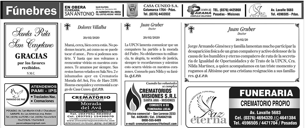 Fúnebres del viernes 21 de febrero de 2020