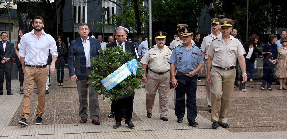 El intendente Leonardo Stelatto encabezó la ofrenda de laureles realizada al pie del monumento del General José de San Martín, “Libertador de América”, en la plaza que lleva su nombre en el microcentro posadeño a primera hora de la mañana.