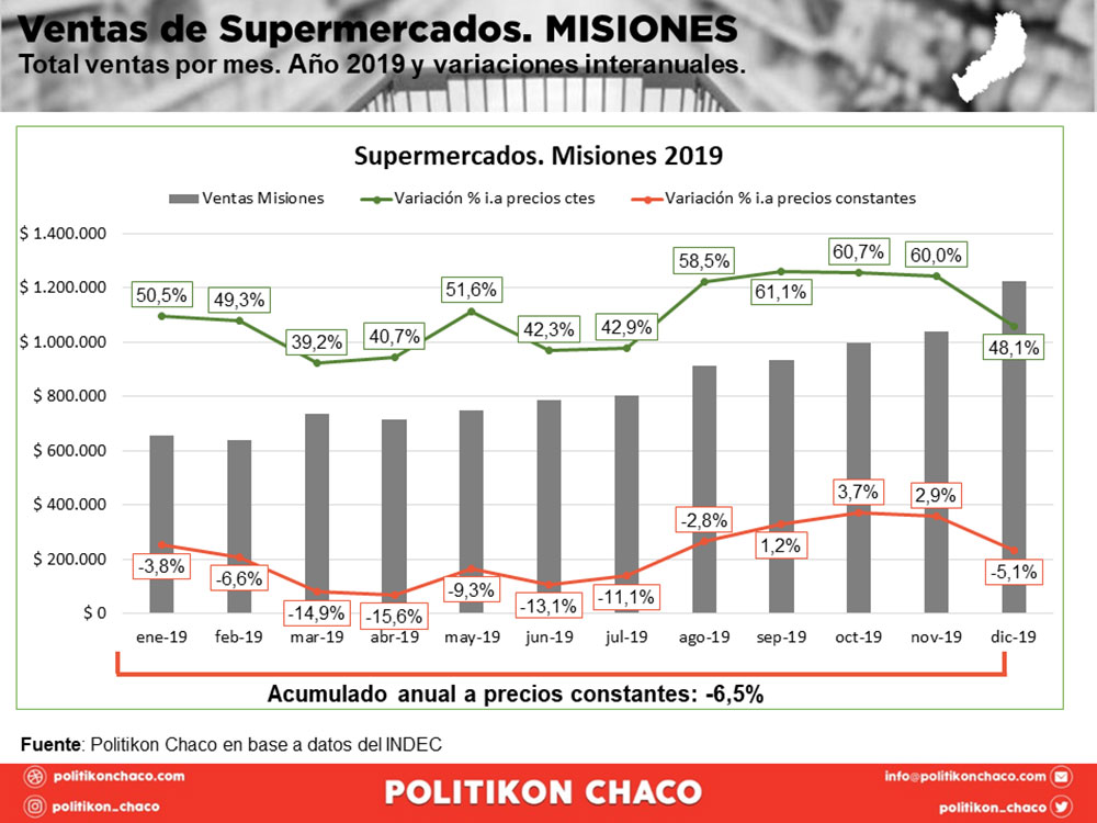 La provincia de Misiones, durante todo el año 2019, tuvo un descenso en las ventas a precios constantes del 6,5%, siendo así inferior a la media nacional, que marcó una caída del 9,7%, y la más baja en la región del NEA, siendo además la tercera más baja del país.