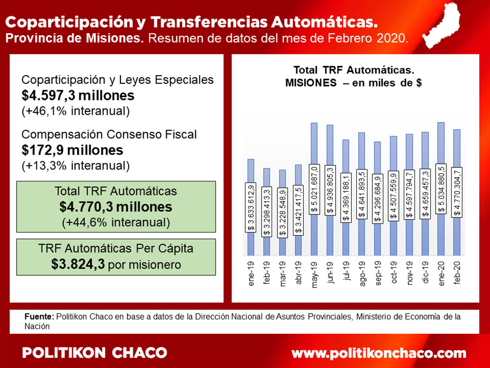 Durante febrero 2020, a Misiones ingresaron $4.770,3 millones en concepto de transferencias automáticas de recursos de origen nacional (coparticipación, leyes especiales y compensación del Consenso Fiscal), significando un incremento del 44,6% respecto al mismo mes del 2019, pero cayendo un 5,3% comparado con enero 2020. Hasta acá, los datos parecen positivos.