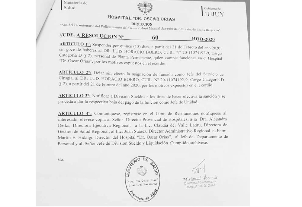El gobierno de Jujuy, tras la repercusión del caso en medios locales, publicó este sábado en su página oficial un comunicado aclarando los motivos de la sanción, los cuales, según lo expresado, fueron “omitidos de manera intencional” por el médico, Horacio Boero, quien fue suspendido por 15 días y se lo apartó como Jefe del Servicio de Cirugía.