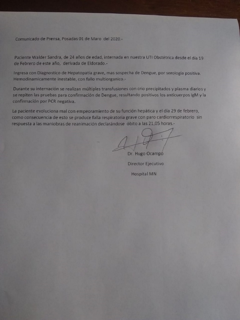 “Cuando ella ingresa su diagnóstico fue fallo hepático; es decir tenía fallo hemodinámico, síndrome de dificultad respiratoria y por eso se la trasladó al Materno donde tenemos la unica terapia en Misiones con terapistas obstétricos especializados en terapia intensiva obstétrica. Estuvo internada en el mejor lugar donde se hizo todo lo que se podía haber hecho”, dijo Alarcón al lamentar su fallecimiento.