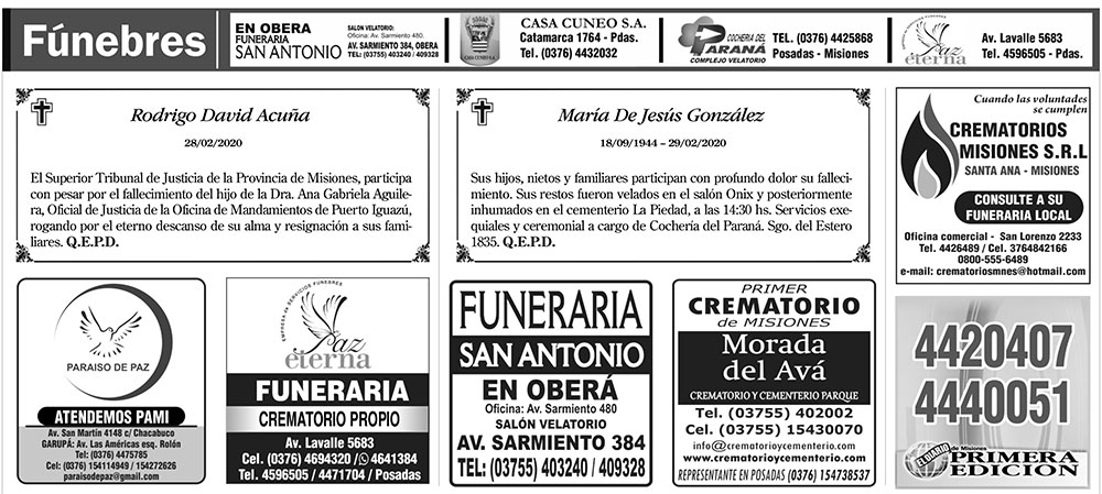 Fúnebres del lunes 2 de marzo de 2020