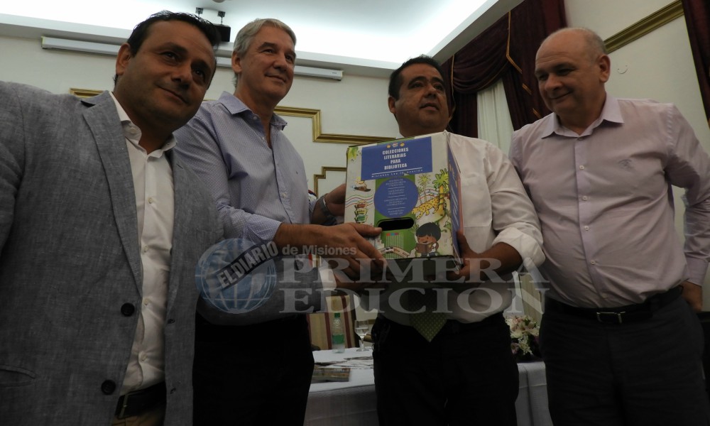 En conferencia de prensa, el gobernador de Misiones, Oscar Herrera Ahuad, junto al vicegobernador, Carlos Arce, el ministro de Educación, Miguel Sedoff, y el subsecretario de Cultura, Joselo Schuap, hicieron entrega de los primeros kits de libros a los directivos de diversas escuelas posadeñas.