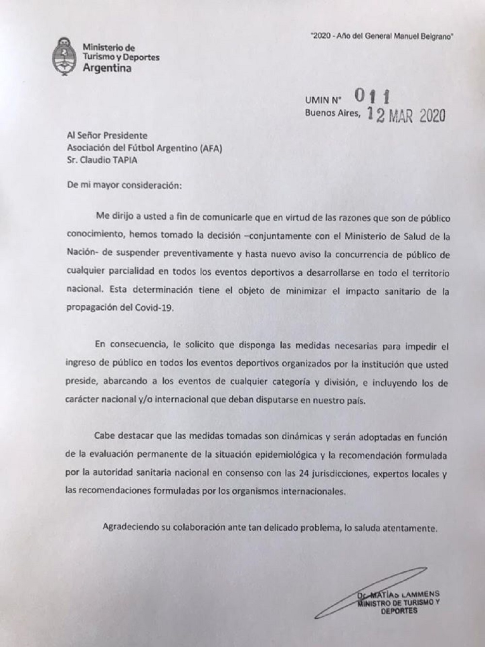 En una nota emitida por el Ministerio de Turismo y Deportes conjuntamente con el Ministerio de Salud, se resolvió por tiempo indeterminado la prohibición de ingreso de publico a todos los eventos futbolísticos disputandose los mismos a puertas cerradas.
