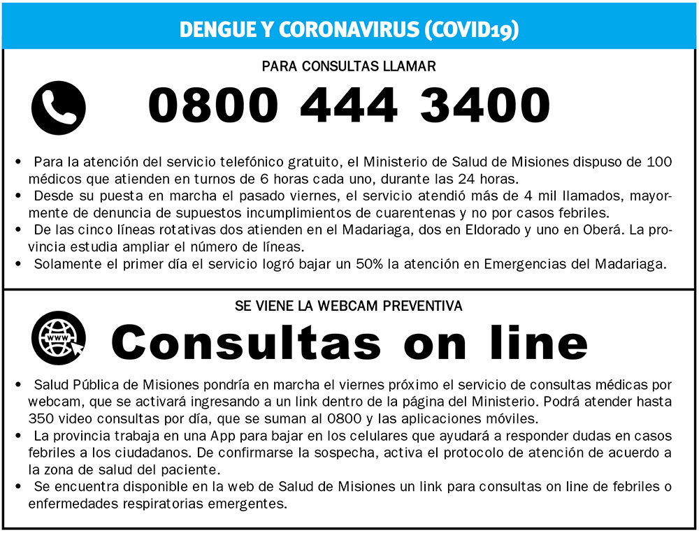 • Dueño de supermercados chinos en Eldorado: tras ser advertidas las autoridades sobre el posible incumplimiento de la cuarentena por parte de un empresario de supermercados de origen chino, Salud logró establecer que “la persona no viajó dentro de la emergencia a su país. De igual modo, junto a autoridades municipales se lo notificó de las normativas vigentes”, explicó Alarcón.