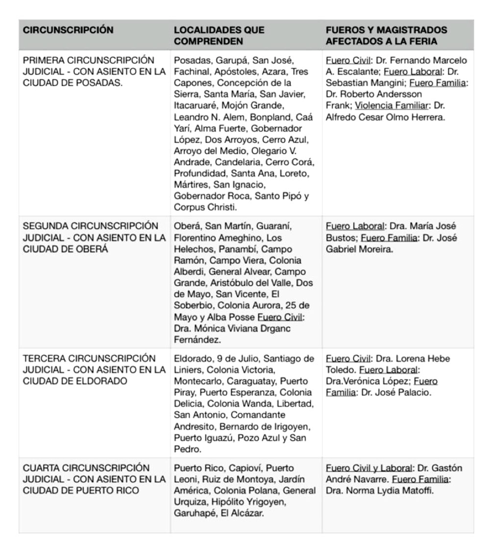 En el siguiente cuadro se puede apreciar cada circunscripción; las localidades que abarca y los magistrados que estarán de turno en esta Feria Extraordinaria: