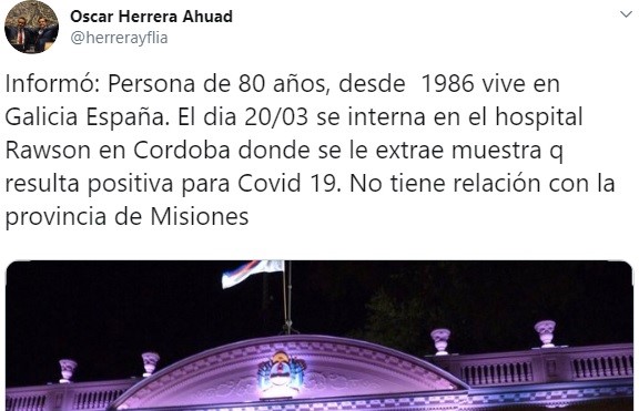 “Desde el año 1986 vive en España y regresó hace más de 10 días a la Argentina, donde se trasladó a la provincia de Córdoba. El día 20 de marzo asistió al Hospital Rawson de Córdoba, donde quedó internado y el día 20 de marzo le realizaron el hisopado en el mismo hospital“, logró revelar la Casa de Gobierno misionera sin que el Ministerio de Salud nacional rectificara su parte o diera la misma precisión.