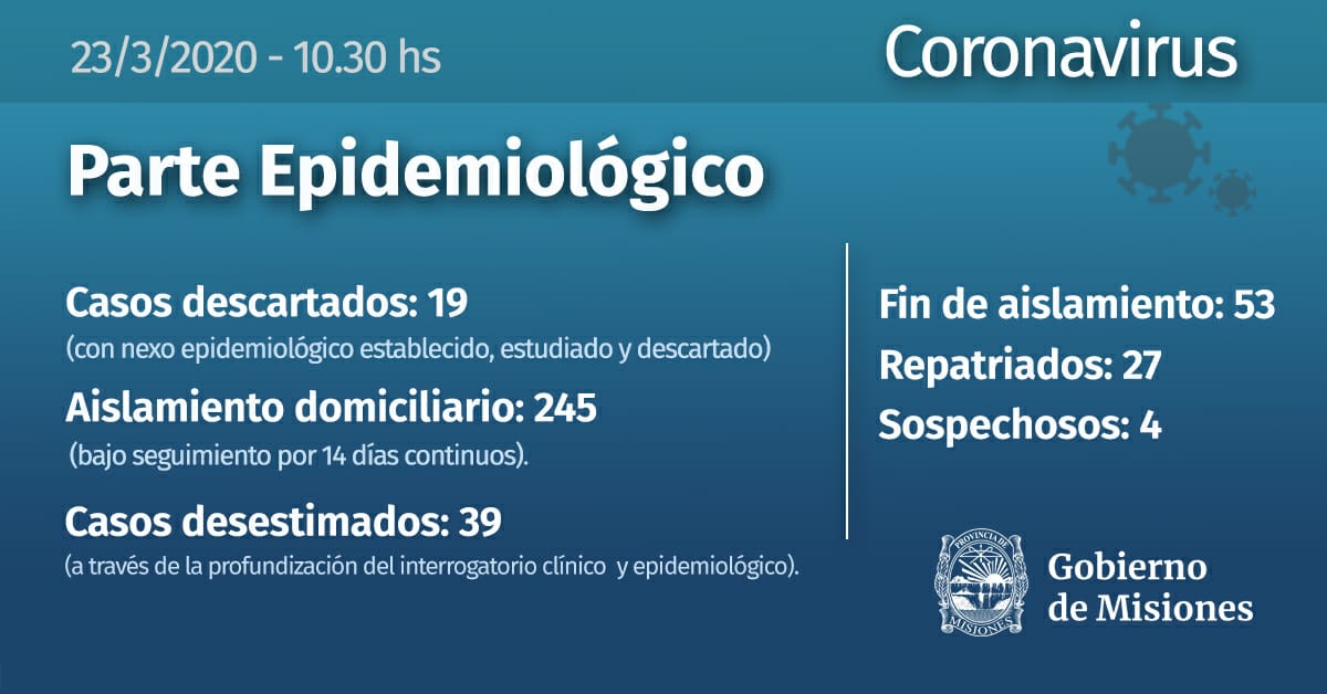 En el parte epidemiológico provincial, emitido este lunes a las 10.30, el Gobierno informó que en Misiones hay cuatro casos sospechosos, 245 personas bajo monitoreo continuo, en aislamiento domiciliario, y ningún caso confirmado.