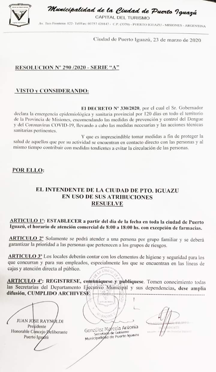 Mediante la Resolución 290/2020, el Ejecutivo municipal de Puerto Iguazú ordenó que todos los comercios en la ciudad deberán cumplir con el horario único de 8 a 18 exceptuando a las farmacias.