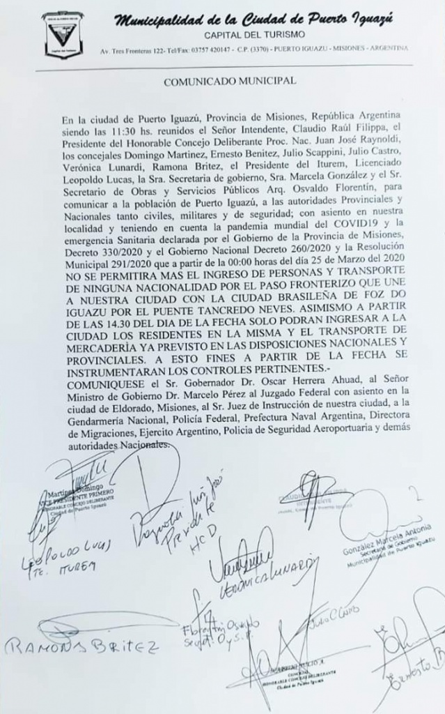Con la firma del intendente Claudio Filippa, de los concejales Domingo Martínez, Ernesto Benitez, Julio Sacppini, Julio Castor, Juan José Raynoldi, Verónica Lunardi, Ramona Britez, del titular del ITUREM Leopoldo Lucas, entre otros funcionarios que participaron de la reunión; se remitieron las comunicaciones a la Gobernación, la Justicia Federal con asiento en Eldorado, fuerzas de seguridad federales, Migraciones, Ejército, entre otros.