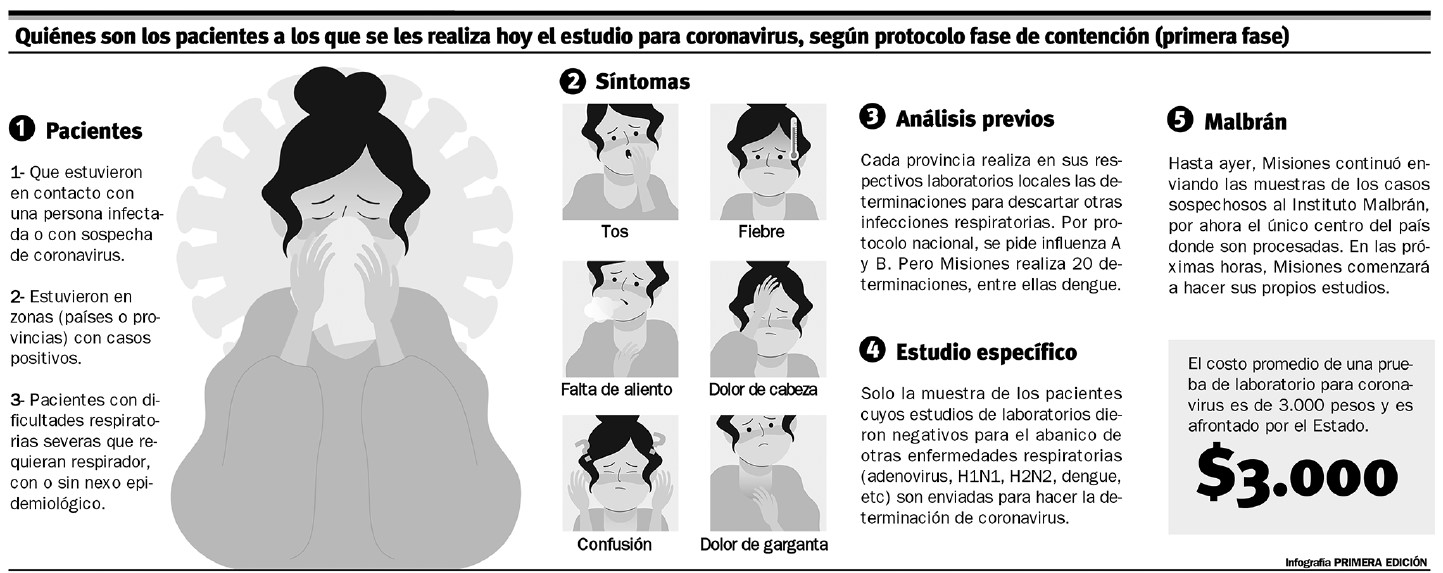 Destacó además que el laboratorio para descartar coronavirus no es a demanda del paciente, sino por indicación médica en casos puntuales: cuando una persona con síntomas tiene nexo epidemiológico o estuvo en una zona con casos, cuando un paciente sufre falla respiratoria grave (con asistencia respiratoria) sin causas conocidas (ver infografía).