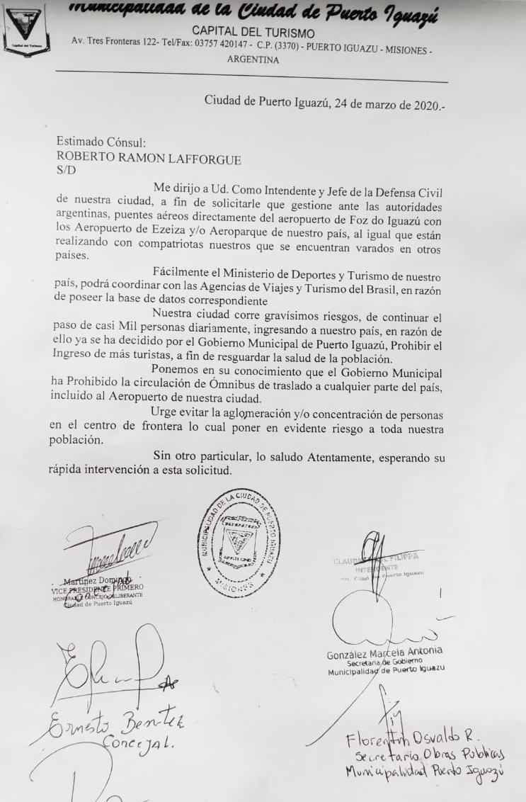 A través de un documento formal dirigido este martes al cónsul Roberto Ramón Lafforgue, el intendente iguazuense Claudio Filippa le solicita que interceda y solicite la implementación de puentes aéreos entre Foz y Buenos Aires para el traslado de los argentinos que todavía tratan de volver al país.