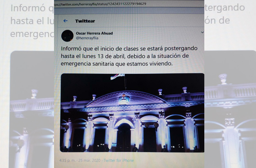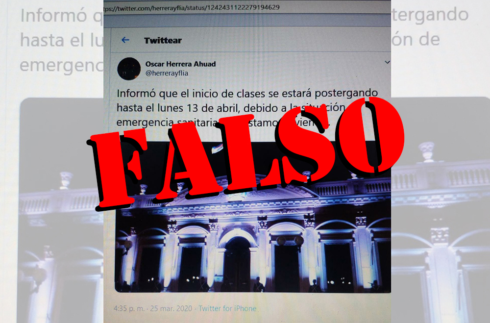 Comenzó a circular en las últimas horas la imagen de un supuesto tuit del gobernador de Misiones, Oscar Herrera Ahuad, donde informa que el inicio de clases se postergará hasta el 13 de abril, “debido a la situación que estamos viviendo”.