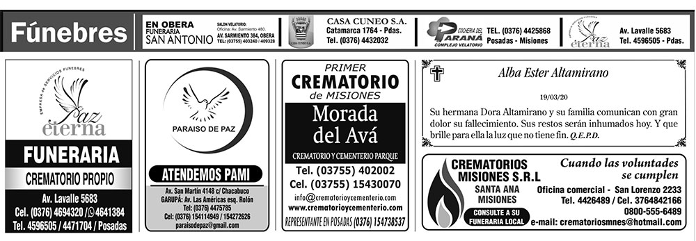 Fúnebres del viernes 20 de marzo de 2020